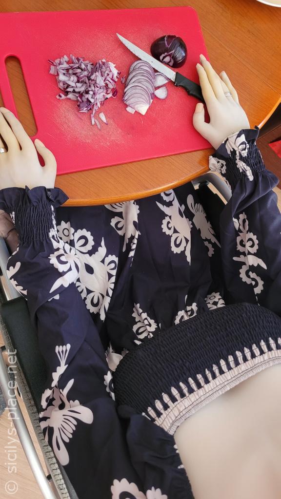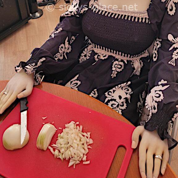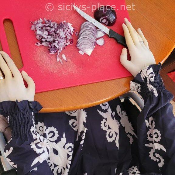 - Add the white onion to the fried peppers, mix everything well. Fry until the onion is golden brown and the peppers have softened.