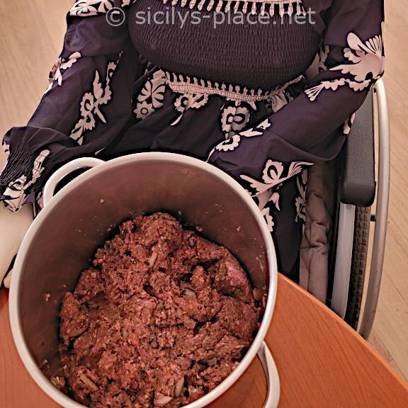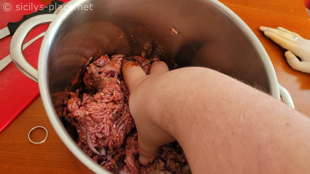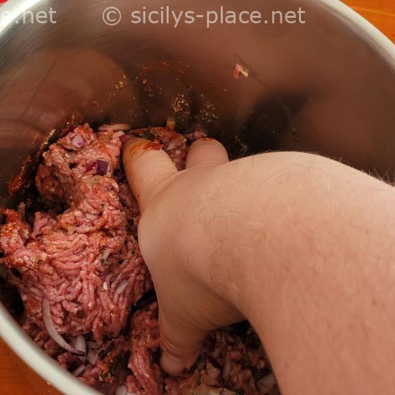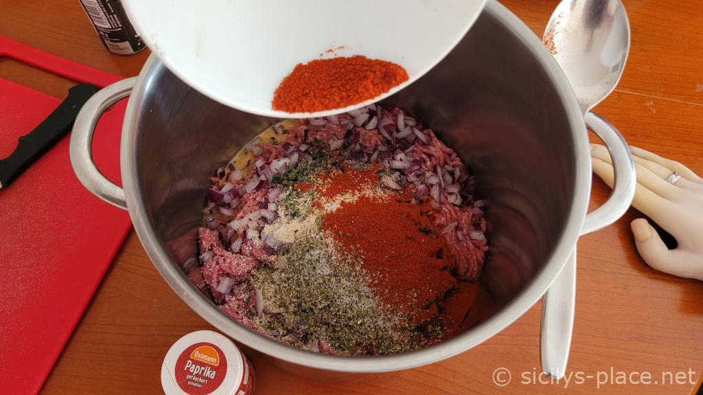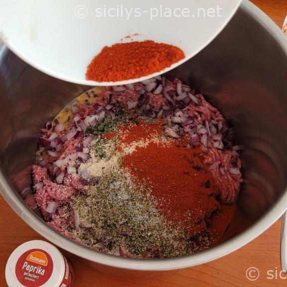 - Put the beef with the eggs and red onion in a suitable container, add the garlic powder, coriander leaves, dill tips, breadcrumbs, salt, black pepper, Italian herbs and smoked paprika.