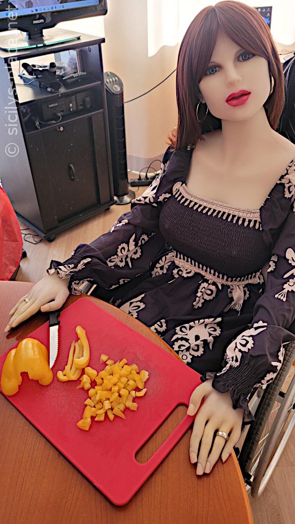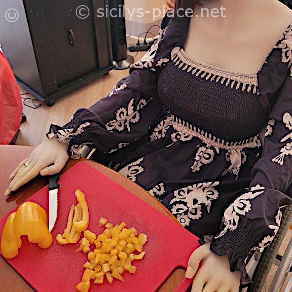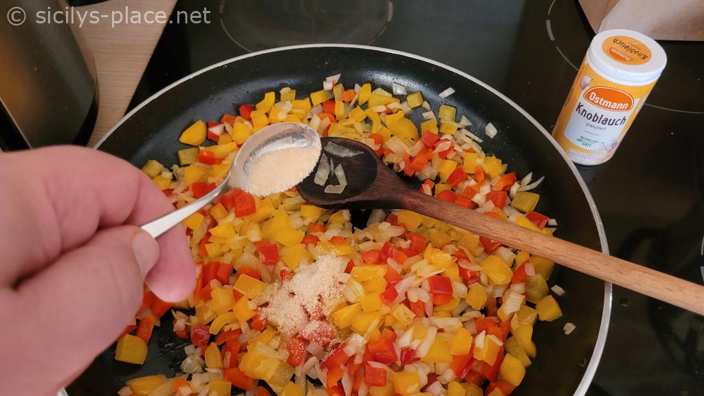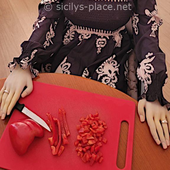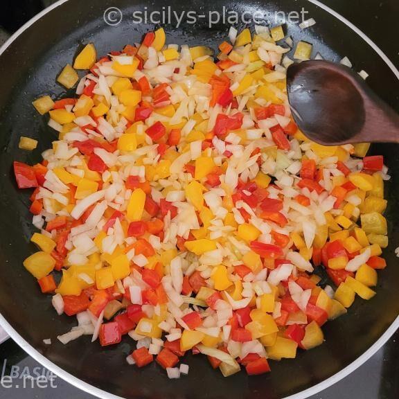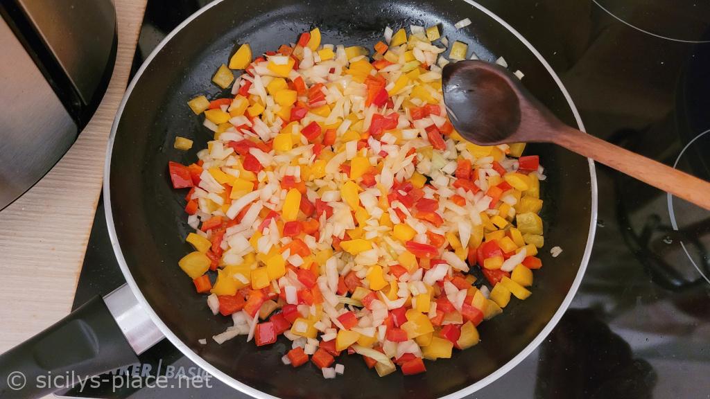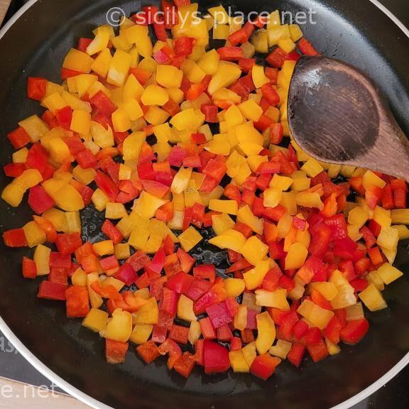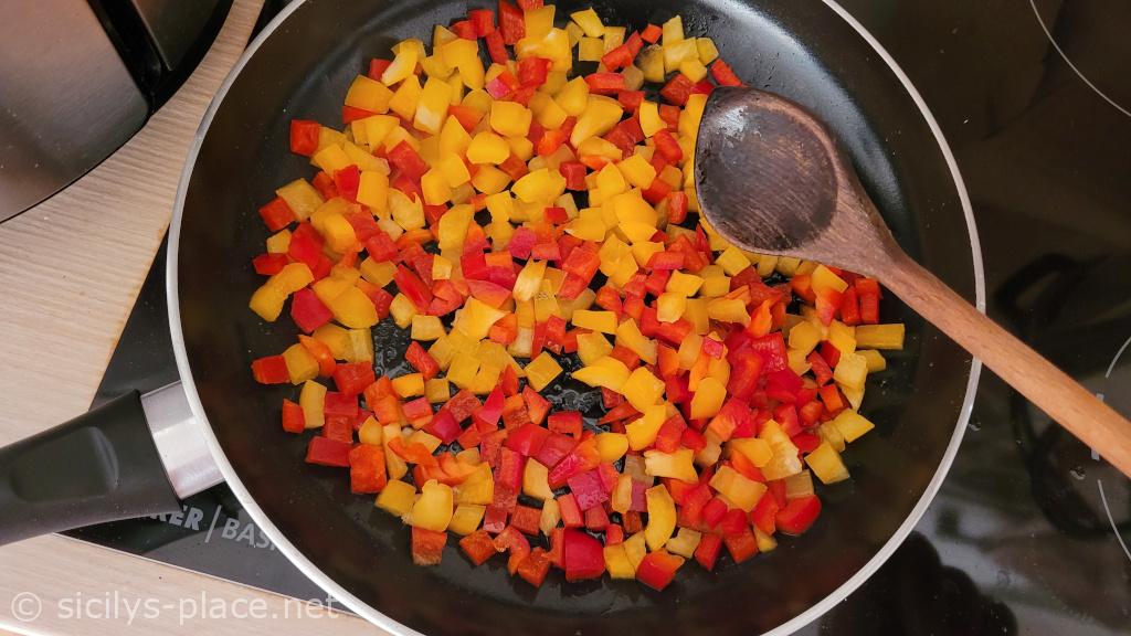 - Pour a little olive oil into a heated pan. Fry the well mixed peppers over low heat for 5 minutes.