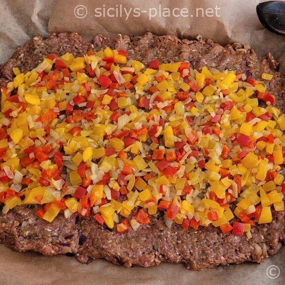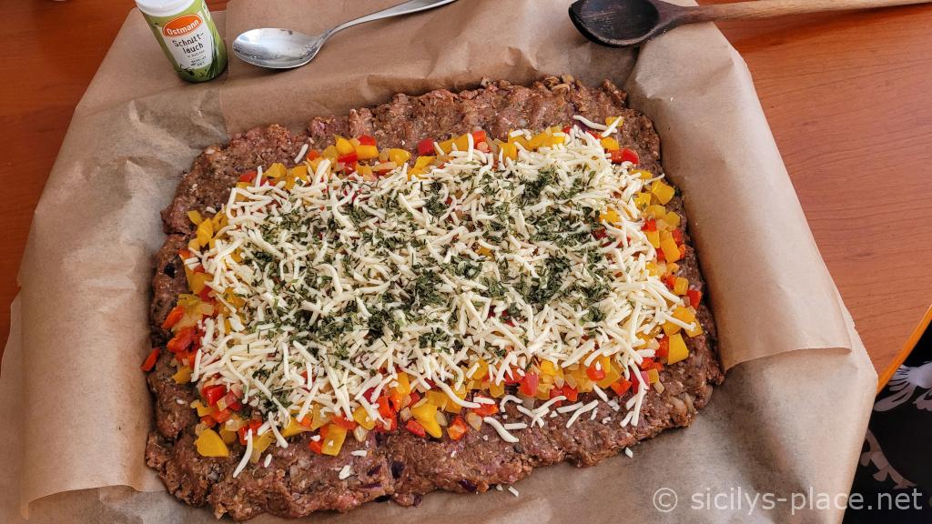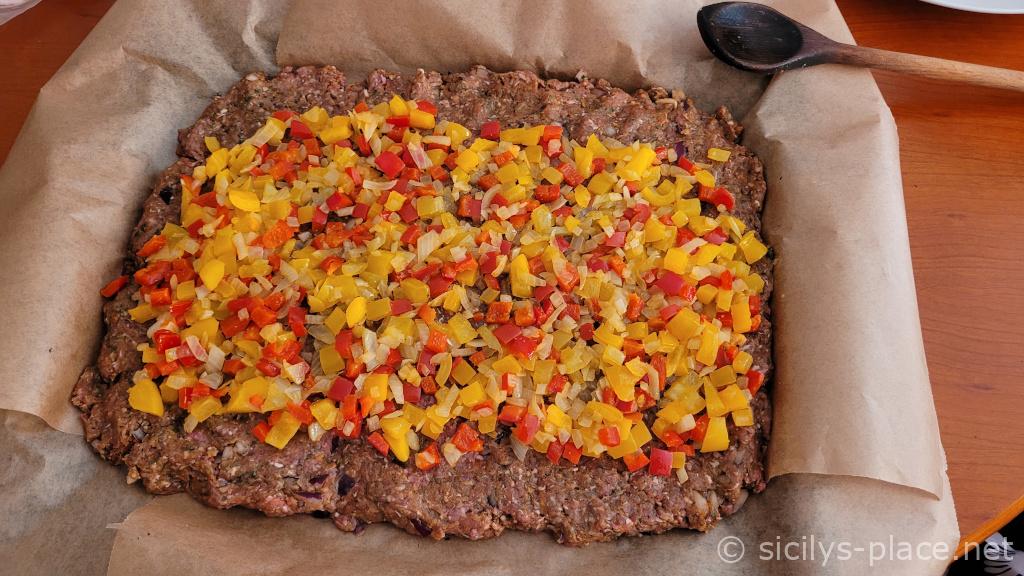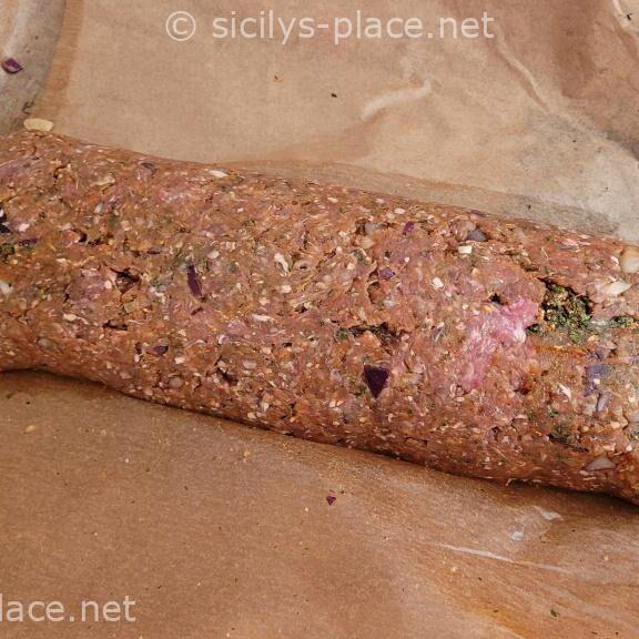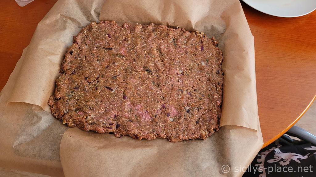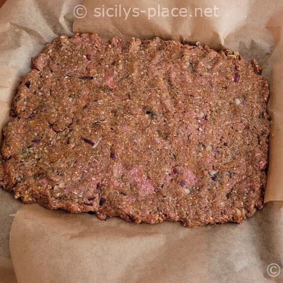 - Line a baking tray with baking paper. Spread the meat and shape it into a rectangle.