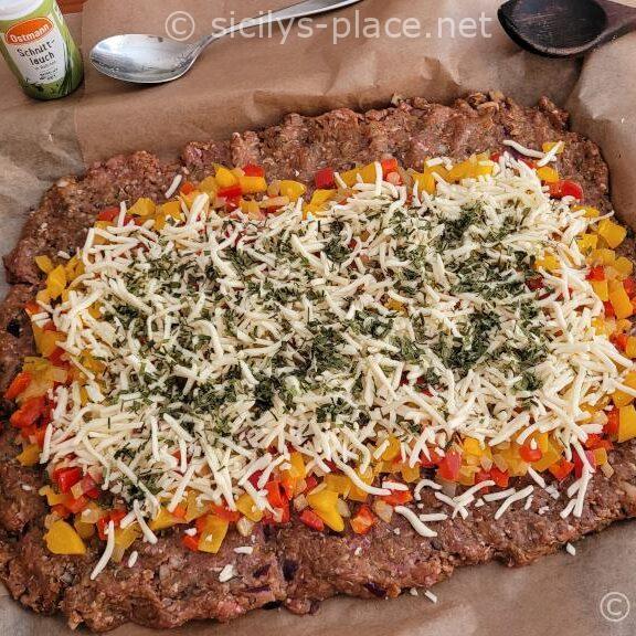 - Sprinkle the mozzarella and the chive rolls over the filling.