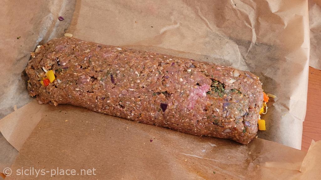 - Grab the edges of the paper and roll up the meatloaf. Press down slightly on top.