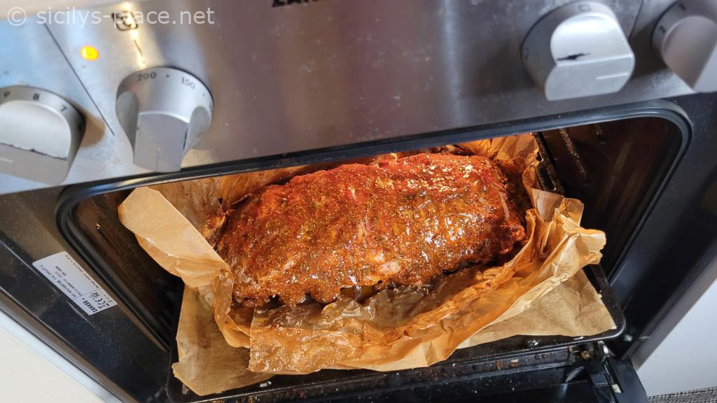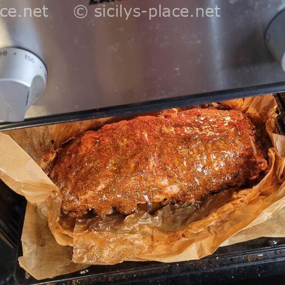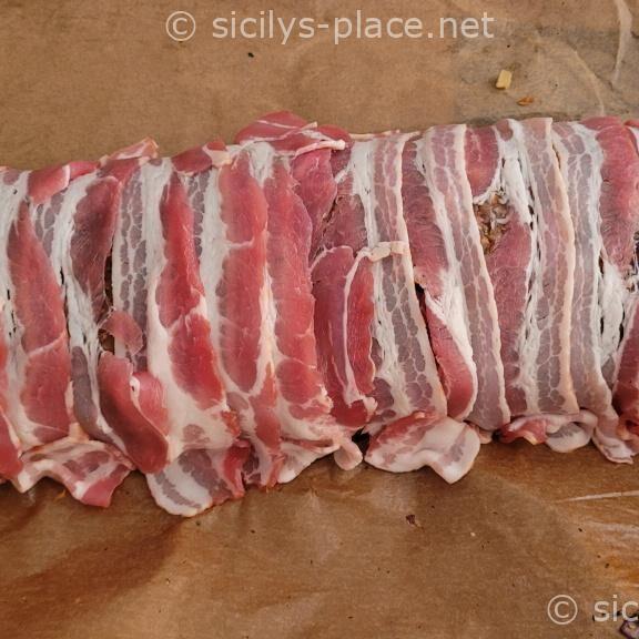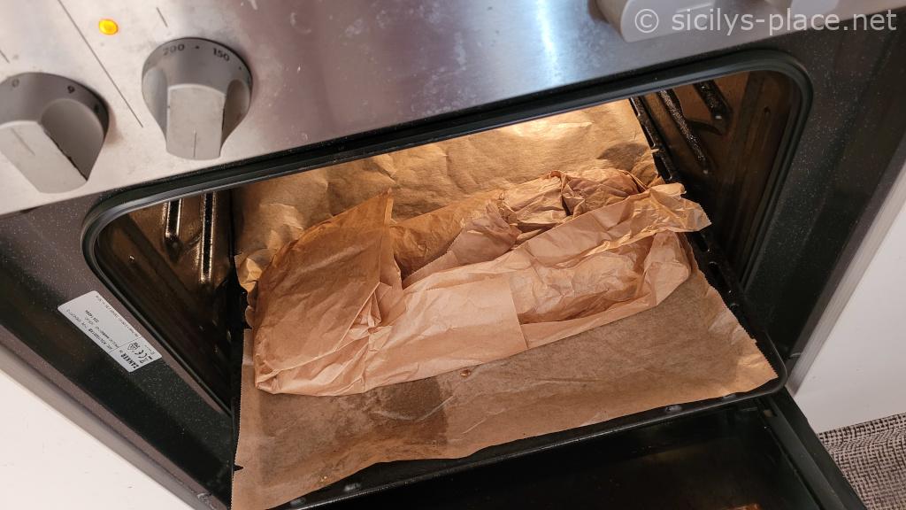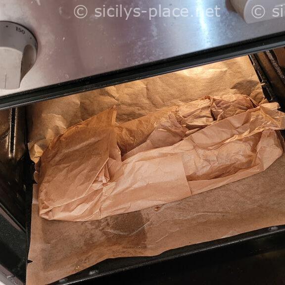 - Remove the baking paper from the top of the loaf and seal its edges with meat.