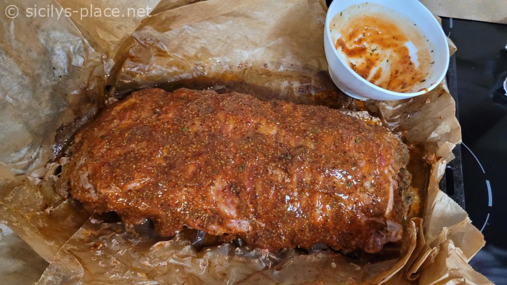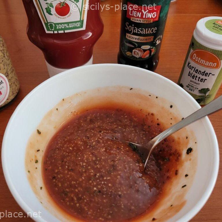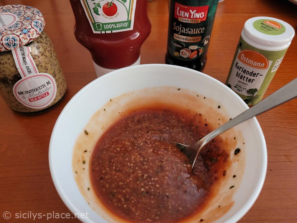 - For the glaze, mix the tomato ketchup, soy sauce, French mustard and coriander leaves well together.