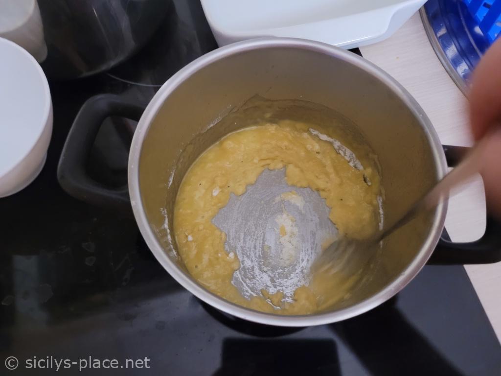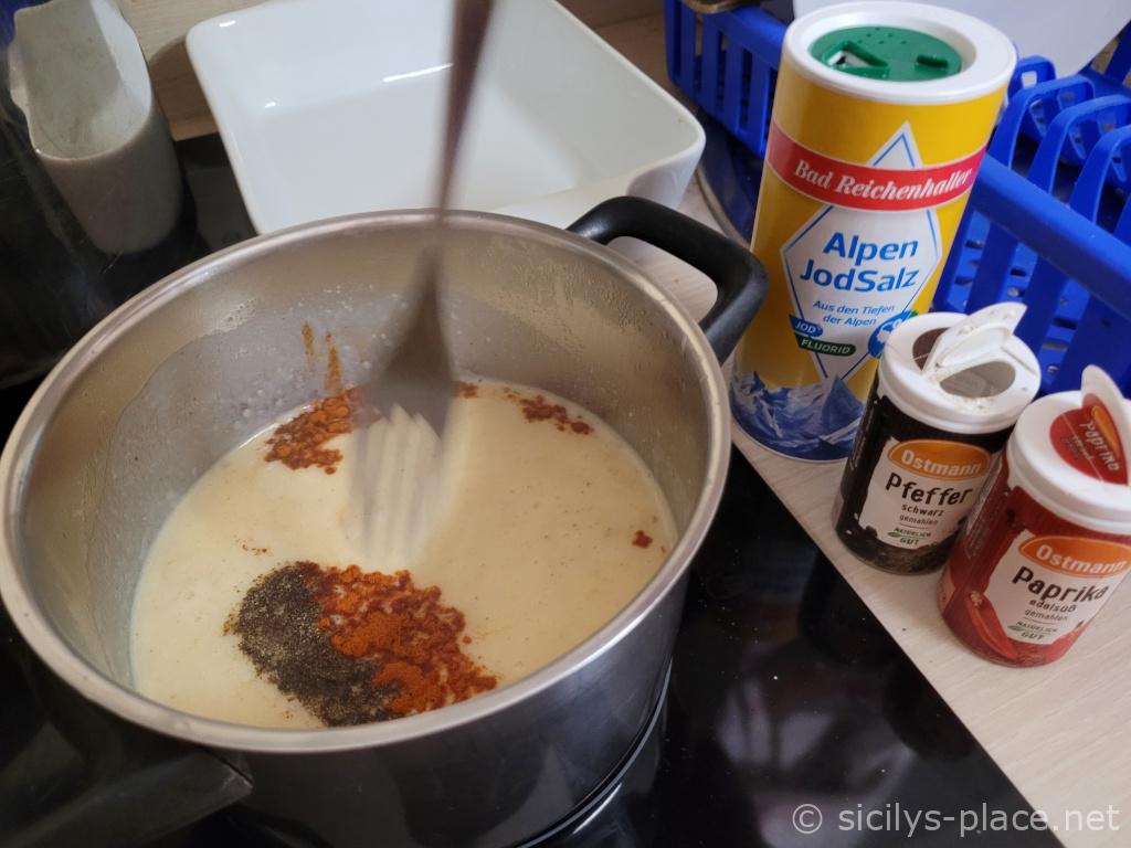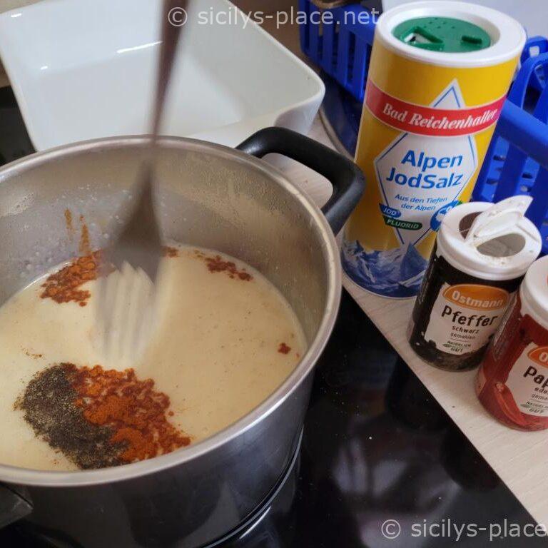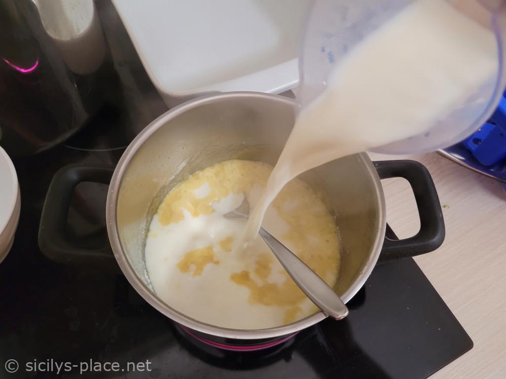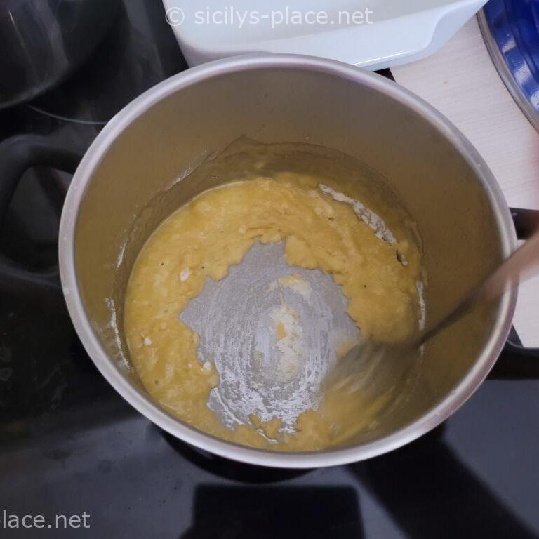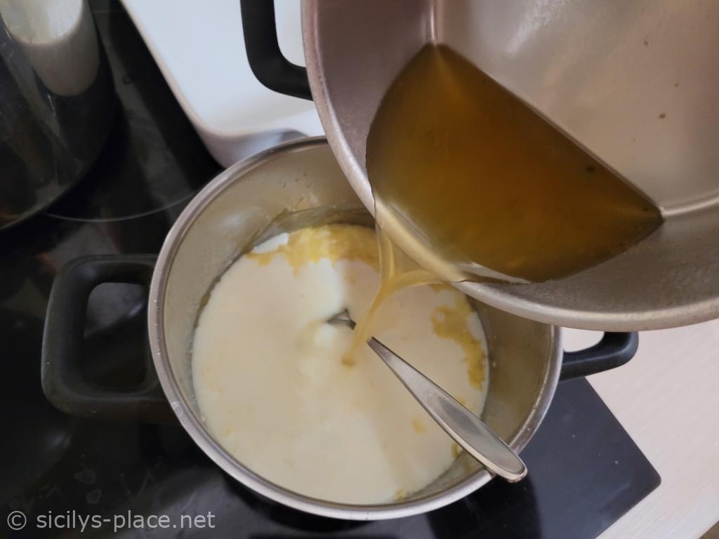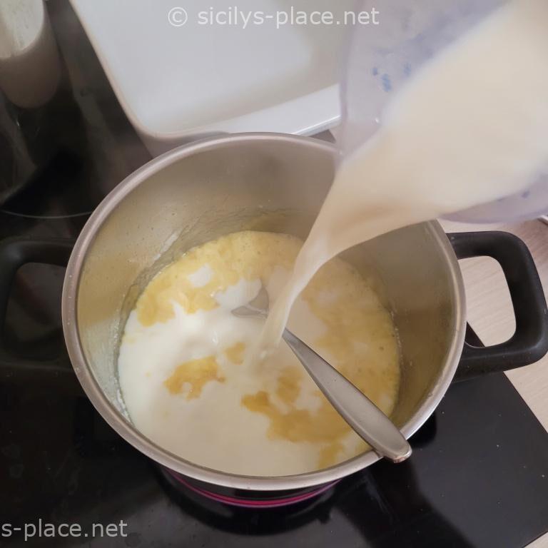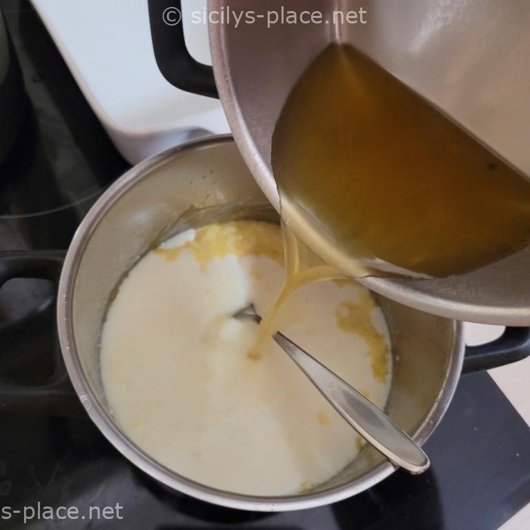 - Stir in the milk and the vegetable stock and allow to thicken.