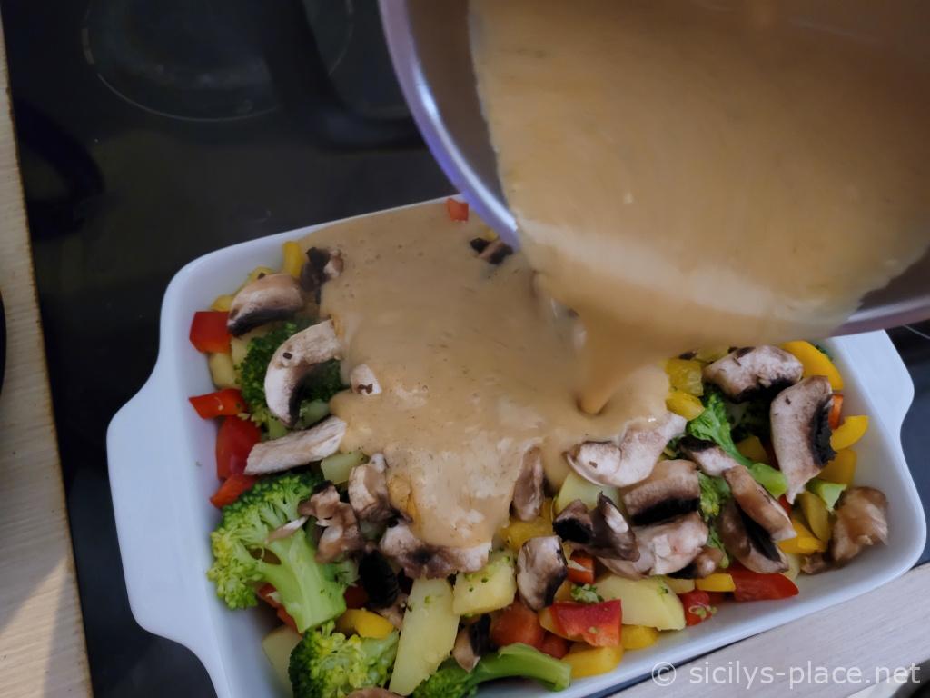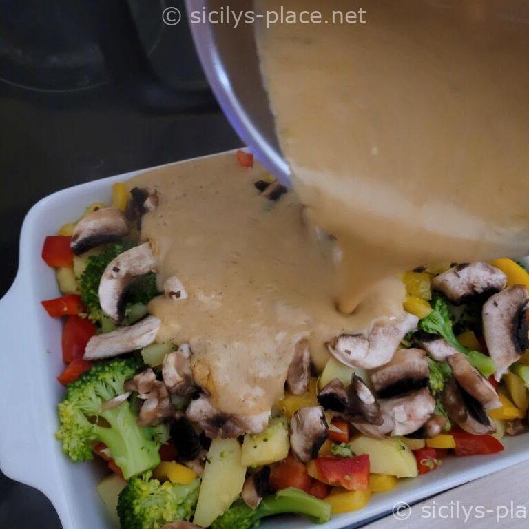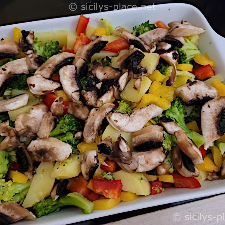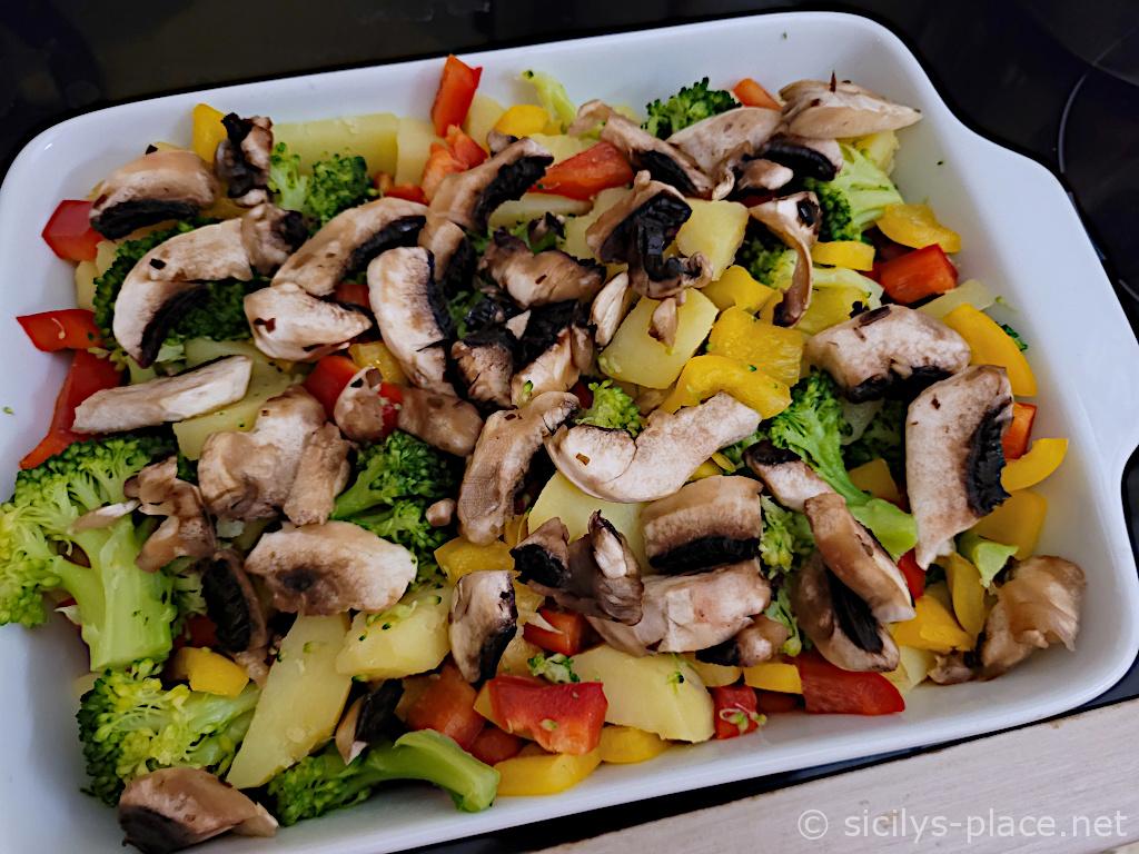 - Put the vegetables and potatoes in a baking dish. Spread the mushroom slices on top.