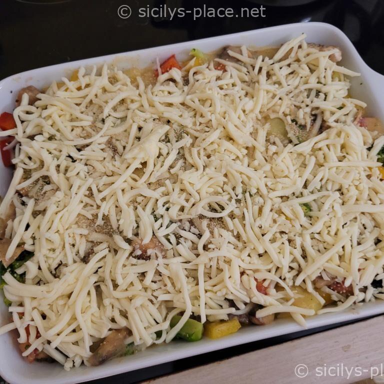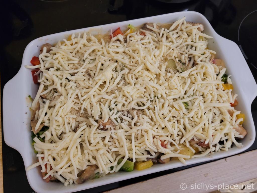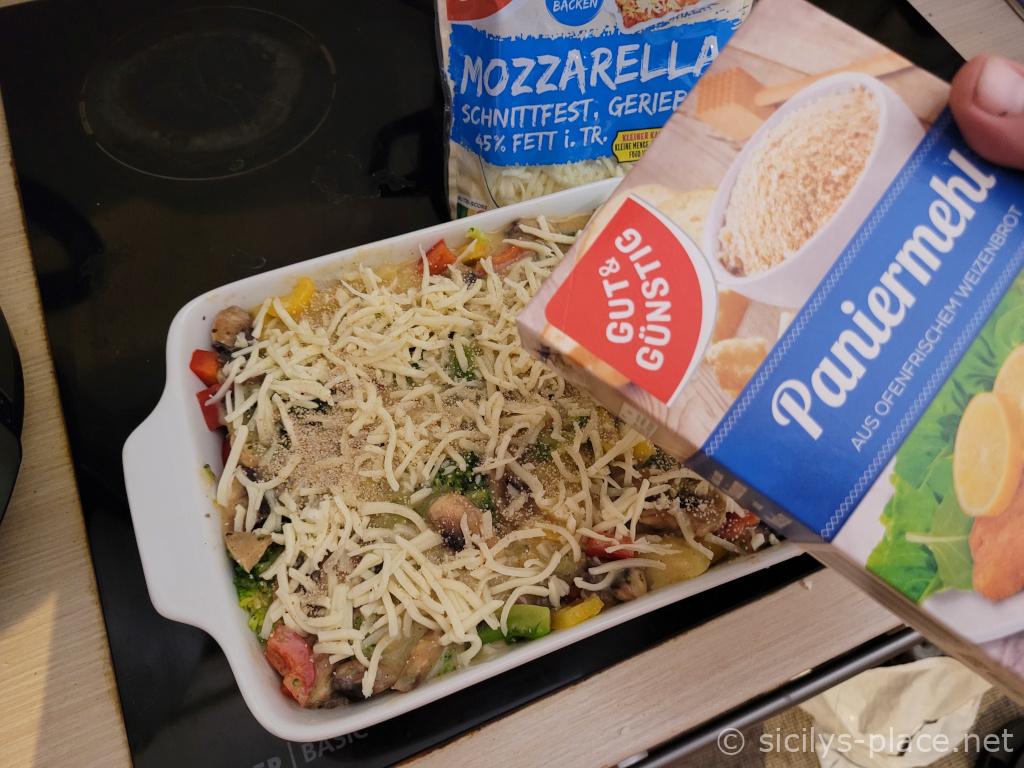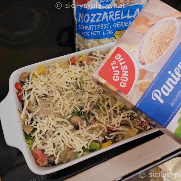 - Sprinkle the grated mozzarella. In between, also sprinkle some breadcrumbs so you will get a nice crust.