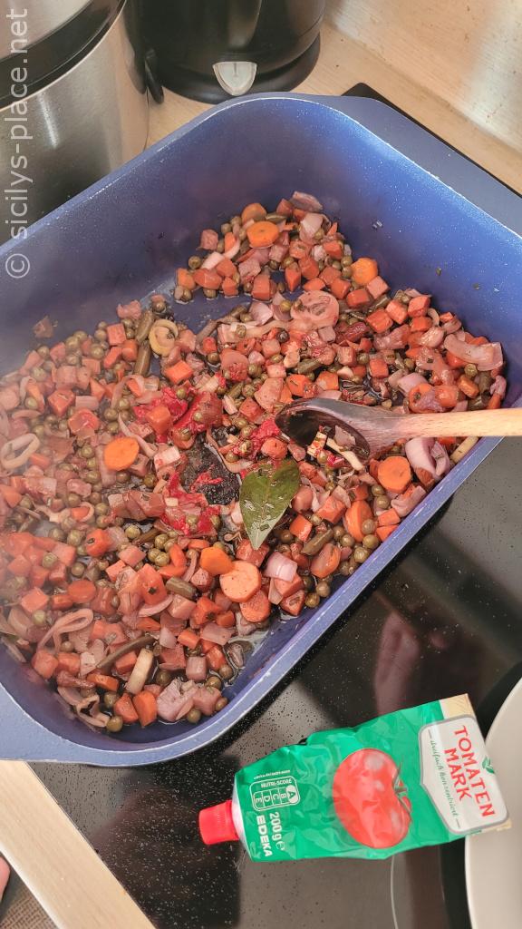 - Remove the meat, add the vegetables to the roasting pan and fry well.