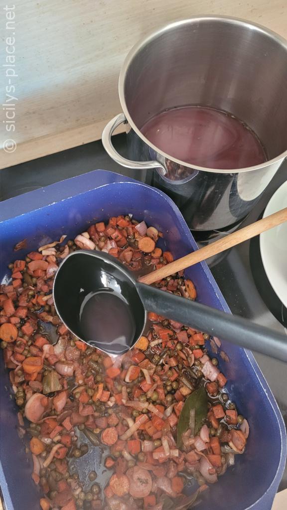 - Add the chunks of leek, carrots and onions as well as the soup vegetables and chives.