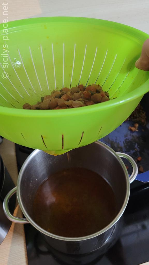 - Remove and dry the meat and separate the liquid from the vegetables.
